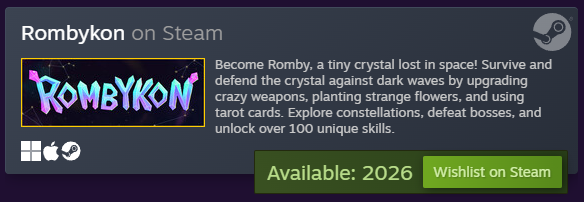 Rombykon is a tower defense bullet hell about Romby, a small crystal who must survive and defend his crystal against waves of darkness by upgrading crazy weapons, planting strange flowers, and using tarot cards. Explore constellations, defeat bosses, and unlock more than 100 unique abilities.